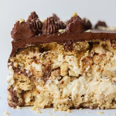 Повітряні хрусткі безешно-горіхові коржі, між ними ванільний масляно-заварний крем і все це покрито вершково-шоколадним кремом. Сказати що це смачно - це нічого не сказати!